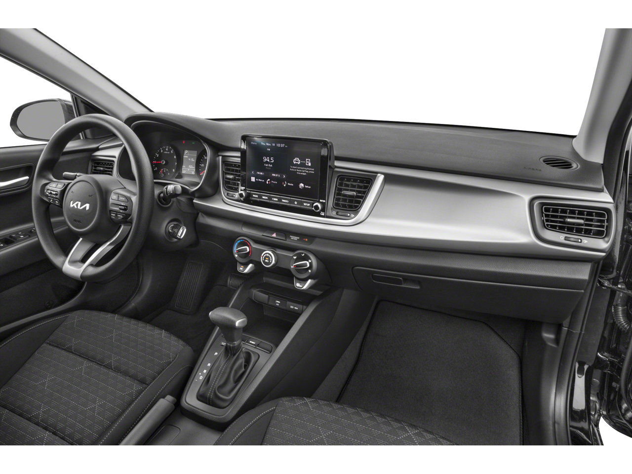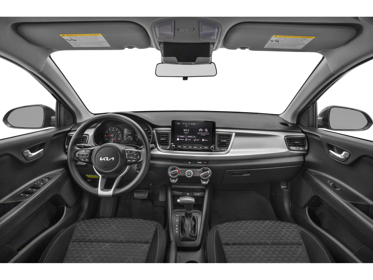 Black Cloth, 6 Speakers, ABS brakes, Air Conditioning, AM/FM radio, Brake assist, Bumpers: body-color, Driver door bin, Driver vanity mirror, Dual front impact airbags, Dual front side impact airbags, Electronic Stability Control, Front anti-roll bar, Front Bucket Seats, Front Center Armrest, Front reading lights, Front wheel independent suspension, Fully automatic headlights, Heated door mirrors, Illuminated entry, Low tire pressure warning, Occupant sensing airbag, Outside temperature display, Overhead airbag, Overhead console, Panic alarm, Passenger door bin, Passenger vanity mirror, Power door mirrors, Power steering, Power windows, Radio: AM/FM/MP3 Audio System, Rear window defroster, Remote keyless entry, Speed control, Speed-sensing steering, Split folding rear seat, Steering wheel mounted audio controls, Tachometer, Tilt steering wheel, Traction control, Trip computer, Variably intermittent wipers, Wheels: 15 x 5.5J Steel w/Full Covers, and Woven Cloth Seat Trim.